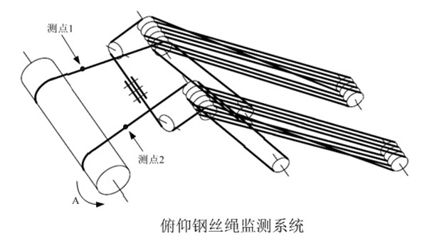 俯仰猫咪网站在线成人免费看系统2个测点布置在卷扬机出绳口附近,这样布置可以监测整根猫咪网站在线成人免费看载荷和弯曲疲劳严重的部分。当卷扬机如图示A方向运动时(即拉起前伸梁悬臂时)磁化与探测同时进行。
